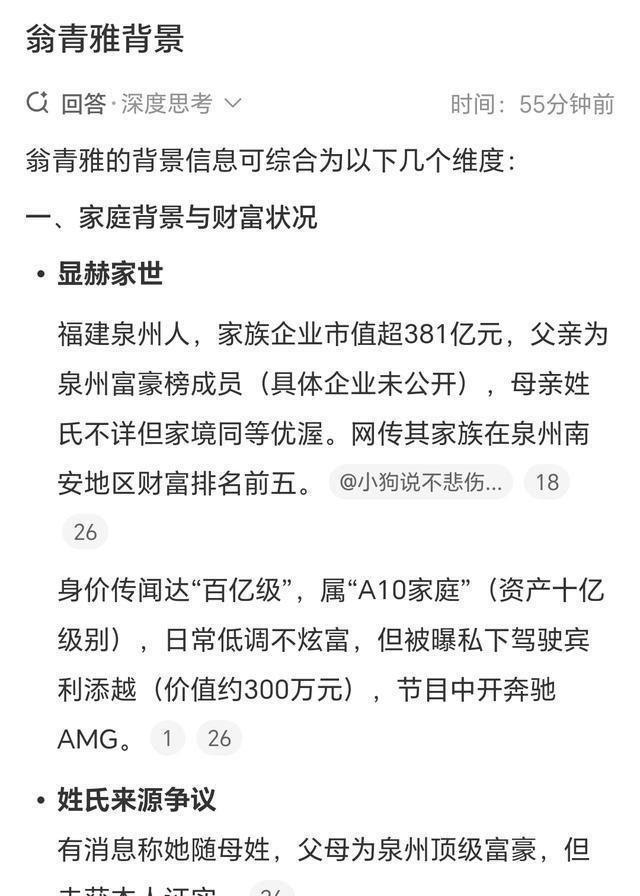 此事件也暴露娱乐圈的乱象,很多人专业能力不行,靠着人脉上位。还有人扒出翁青雅的家庭背景不简单,据说她是一个富家千金。这就难怪了。 翁青雅的确家世显赫,她是福建泉州人,家族企业市亿元,父亲为泉州富豪榜成员。